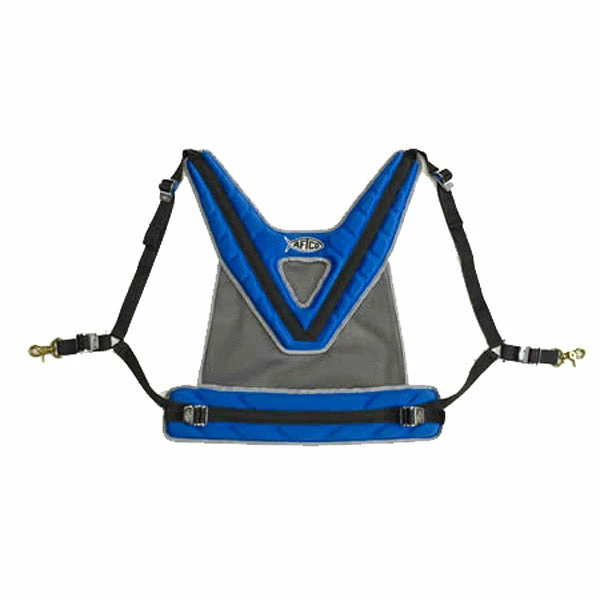 Prop 65 Warning CAAFT-HRNS2 – The Aftco Maxforce II Shoulder Harness is the perfect choice for stand-up battles when using lighter tackle applications up to and including 50-lb. test line. The lycra polyester covered bio-foam shoulder and back-band padding (with synthetic terry cloth liners) connected with ventilated mesh distribute the load comfortably, and allow the shoulders and upper body to carry the load during extended light to medium-tackle fights with stubborn gamefish. The four stainless steel ladder-locks are easily adjustable for the perfect fit, even when under load, and the stainess steel carabiner clips provide a secure attachment to reel harness lugs. All of the nylon webbing straps are cross and box-stitched at the critical locations for extreme durability. Included is a mesh bag with grommets for rinsing the fishing shoulder harness with fresh water and for easy storage. Otherwise, the AFTCO Shoulder Harness is completely synthetic and machine washable. One size fits most. C13-10365