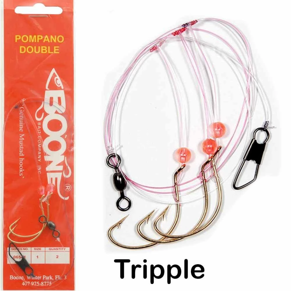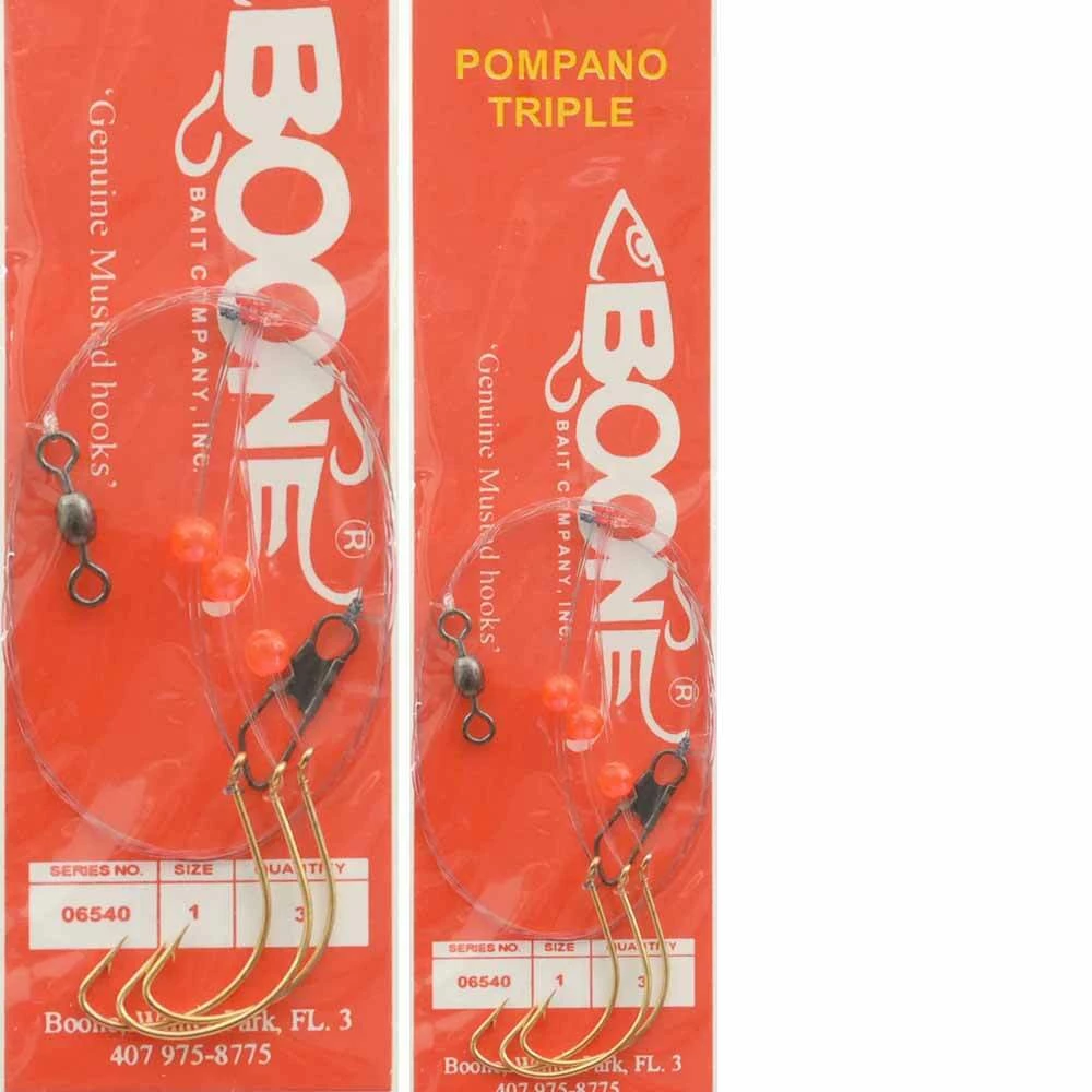 The Boone Pompano Triple 3 Drop Rig has a gold wide gap hooks, black swivel and snap to attach sinkers. Each rig has a red bead.