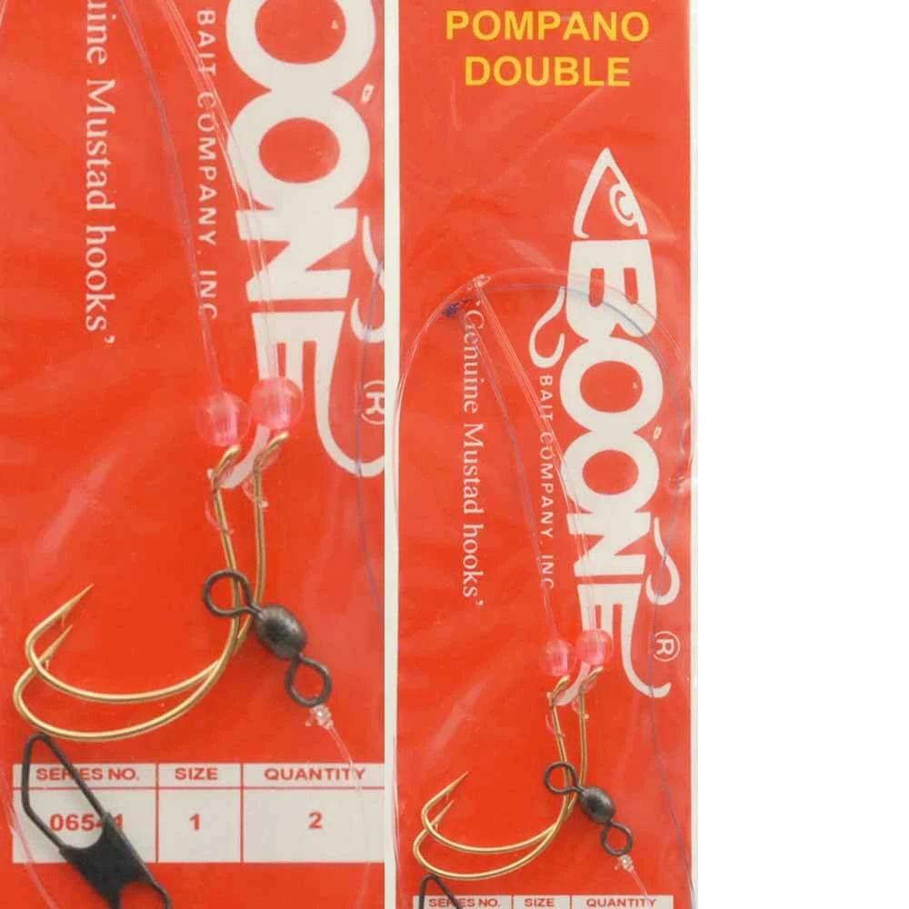 The Boone Pompano Double Rigs has 2 gold wide gap hooks, with swivel snap and red beads.