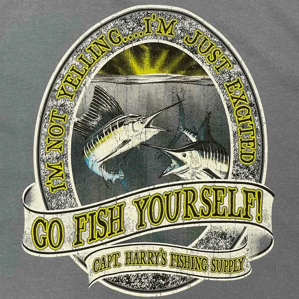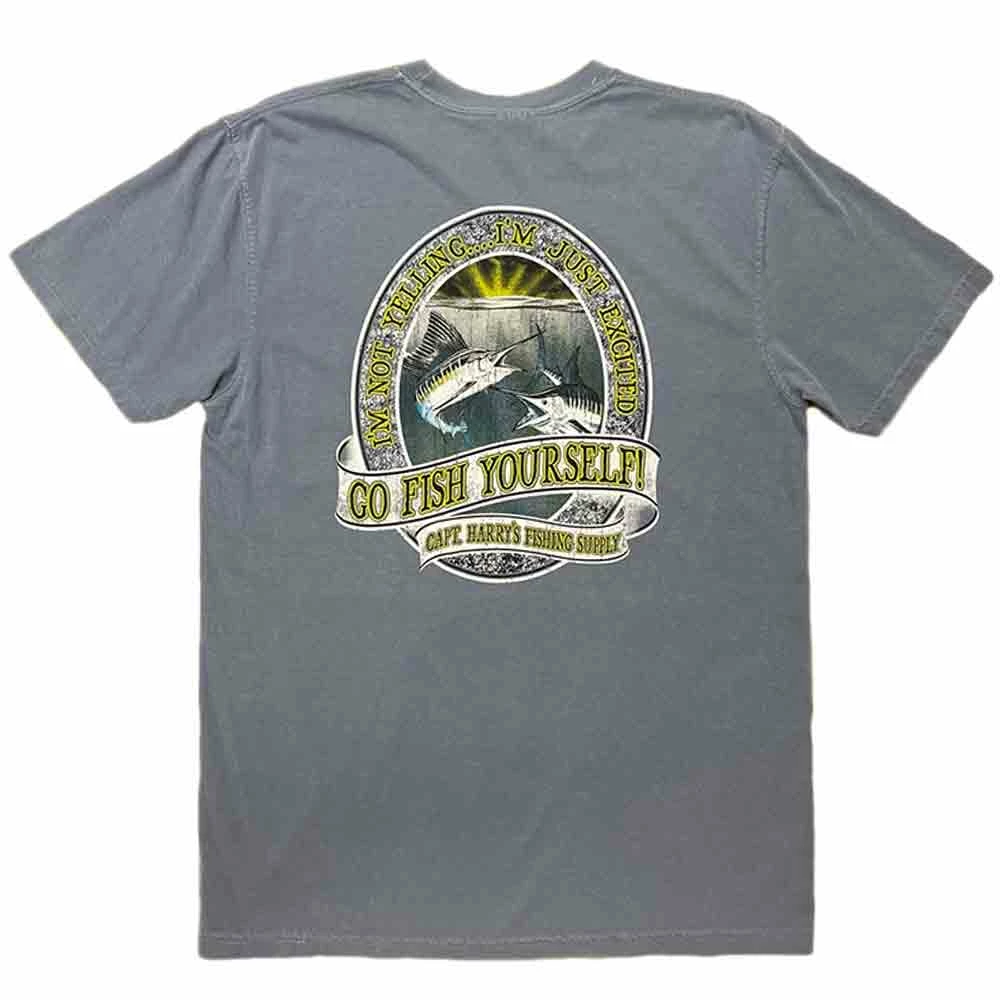 The Go Fish Yourself S/S Blue T-Shirt features 100% cotton construction. The saying on the back was born on a beautiful day offshore fishing. A certain someone, who shall remain unnamed, was yelling out “instructions” and when he was asked to stop yelling he said, “I’m Not Yelling….I’m Just Excited!”. I told him to “Go Fish Himself!”