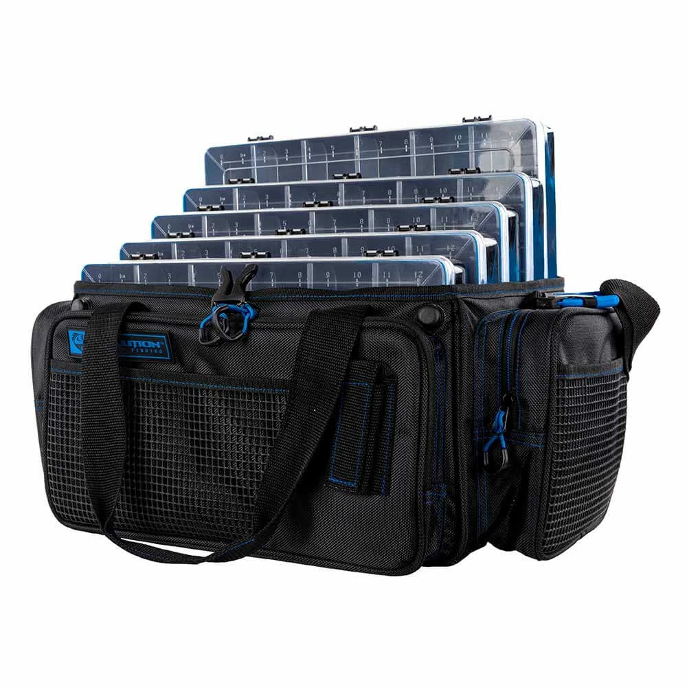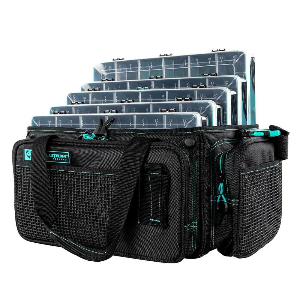 With its open top feature and extremely rugged wear-resistant 1680D construction, the Evolution Outdoor 3700 Horizontal Drift Series Topless Tackle Bag delivers the quality and functionality that Evolution Fishing is known for. These Drift Series Tackle Bags have an innovative large mouth, open top feature that provides quick and easy access to all your trays. Slide your trays in horizontally with this version of the tackle bag. The integrated tie down Y-Strap will secure your trays in the bag, and in case of stormy weather, these bags are equipped with an integrated rain fly that you can zip up and store away when not in use. With 3 large exterior storage pockets and 4 rubber mesh slip pockets, you’ll have plenty of room to store all your accessories. It’s also equipped with a plier holster, side pocket line spool feed, and a non-slip, waterproof bottom with integrated drainage grommets. Transporting these tackle bags will be a breeze with the adjustable, removable shoulder strap and the padded top carry handle. With the capacity to hold up to 5 tackle trays, it’s more than capable of holding all your fishing essentials. Each tackle bag will include 5 matching color Drift Series Tackle Trays.