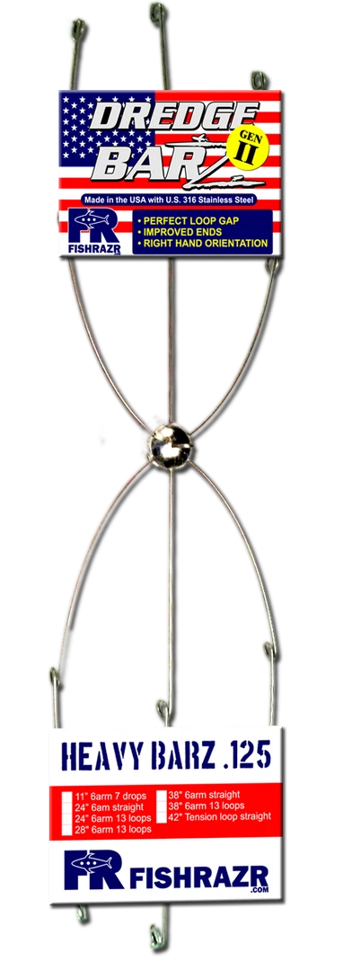 The generation II dredge bar by Fish Razr is the go-to tournament series dredge bar. The 6 arm bars are available in 28” and 38” lengths. The generation II bars feature improved arm loops with increased gap between the loops and arms for easier swivel application. The arms also are now right-hand orientation and have improved downward ends that still allow room to stage a swivel for application. All Fish Razr dredge bars are made of US 316 stainless steel, .125” diameter, precession bends, and super strong metal allow center hubs. This super strong bar will give you plenty of fishing time.