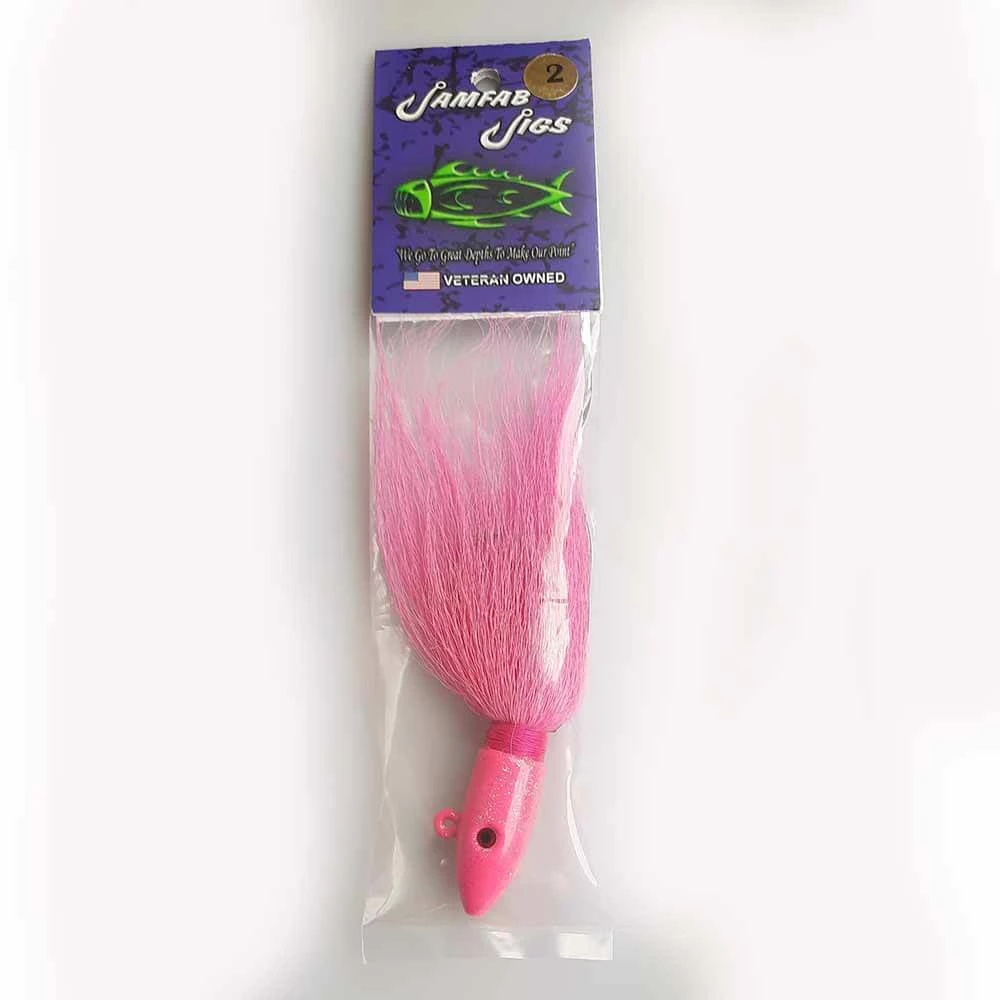 Prop 65 Warning CAThe Banana jigs feature the finest fibers available, heavy duty corrosion resistant saltwater hooks and handcrafted quality and durability. Available in White Heads with variant color hair. Using the Bullet Shape Jig, is perfect for different lure fits and excellent shape For Speed and Accuracy when moving across the water.