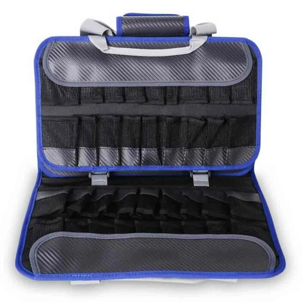 Keeping organized in the boat and at home is all part of the fun. The dry Mustad Jig Pouch Large features many pockets for lures and jigs and an outer pocket, constructed from a tough mesh material or assist hooks and leader material. There are 5 extra-large jig slots that will take jigs up to 11”, 18 jig slots that will take up to 7.5” and 12 slots for smaller jigs up to 6”. In total this practical wallet will accommodate 35 jigs plus room for assist hooks, leader material and much, much more. Features 500Denier Tarpaulin, one-handed carry handle, practical outer mesh pocket and click lock strap closure. The Mustad Jig Pouch Large is practical storage for your lures and tackle.