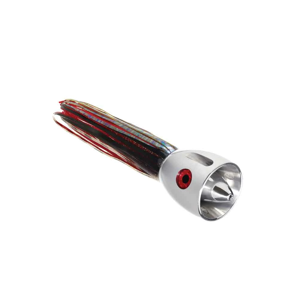 Prop 65 Warning CAThe Red Eye Lures 757 Bullet lure is the little brother to the massive “777” lure and it was designed to be trolled with lighter gear and still produce amazing results for Wahoo! Not everyone trolls with heavy stuff but they still need to be able to target Wahoo. This new design and reduced drag allows serious anglers the ability to high speed troll with 30 # gear. It weighs in at 14 ounces and has a rattle to summon the big fish. It also has 2 OLC vinyl skirts that are hand tied on to present different color options depending on your fishing conditions. Trolled out of the “shotgun” position or a pair of them on your flat lines proves to be an absolute assassin when it comes to meat fish! Recommended rigging options: Single 8/0 or double 8/0 stiffy rig on 275# braided cable.