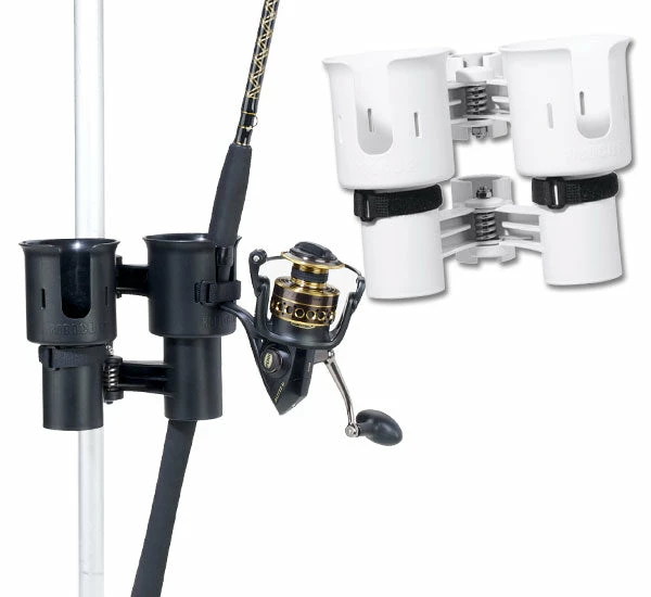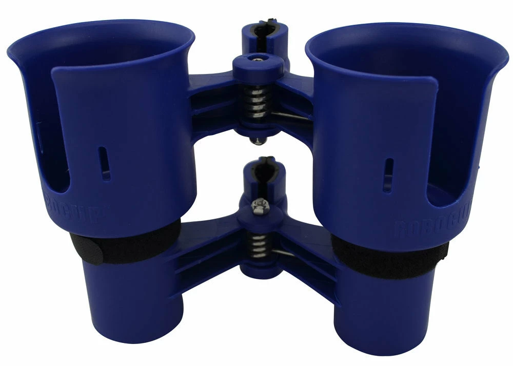 Prop 65 Warning CARoboCup portable caddy securely holds two drinks, two fishing poles, tools, gear and personal belongings including phone, GPS, keys, glasses, flashlight and much more. No tools are required: squeeze to open the wide rubberized jaws that operate with two powerful stainless steel springs. Includes two strong hook & loop straps with nylon buckles that can be inserted in various configurations to secure your gear. The bottom caps unscrew for easy cleaning and access for long objects including fishing poles.