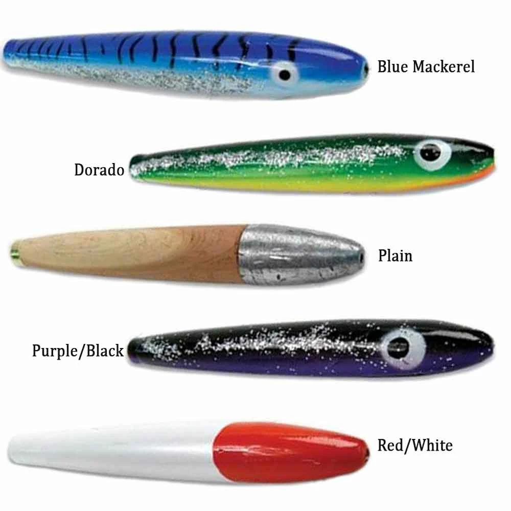The number one tuna fish lure on the East Coast is fast catching on around the world. Available in real natural cedar or a variety of colors. Rigged or unrigged, this lure is great for all gamefish. Cedar Plugs™ are available in 4”, 6”, and 8” lengths. Models rigged “east coast” style have 8’ of leader, a plastic thimble and 3412 Mustad hooks as follows: 4” has a 8/0, 6” has a 10/0, and 8” has a 10/0 hook. The 4” is rigged with 100 lb. test mono, the 6” and 8” are rigged with 150 lb. test mono. Models rigged “West Coast” style have 4’ of mono and a 2/0 crane barrel swivel. The shorter leader allows for casting if desired.