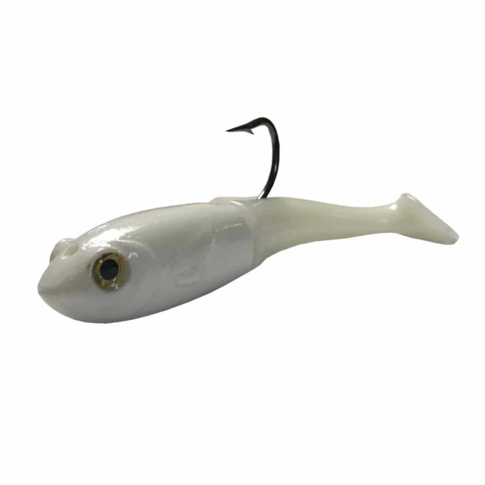 This Swim-bait is a 5 in “line through” lure, with a jig style hook placement for ultimate hook exposure and direct hook sets. When the fish shakes its head the lure slides up the line taking away the leverage from the fish, resulting in less pulled hooks. Great for Tarpon, Snook, Redfish, Trout, Bass, Grouper, Snapper and much more!