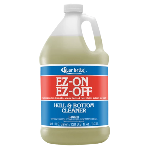Prop 65 Warning CAStar Brite 32oz EZ On EZ Off Boat Bottom Cleaner. EZ-ON EZ-Off Hull & Bottom Cleaner is the best and easiest way to clean dirty bottoms and hulls. Loosens tough marine deposits, removes stubborn stains quickly and without hard scrubbing. Formulated with a special buffered acid that is safer to use than the harsh acids found in traditional bottom cleaners. Ideal for cleaning baitwells, fish boxes or in-deck storage. Removes deposits on boat bottoms, scum line and rust stains quickly and easily. Loosens the toughest deposits on boat bottoms, removes scum lines and rust stains. Water based, environmentally friendly formula. Special patented buffering process makes this product safer than other acid based bottom cleaners. Directions: Remove boat from water and knock off large marine deposits. Allow marine deposits and stains to dry thoroughly. Stains and deposits found above the water line may be removed while boat is in water. Pour product into an open plastic container and apply to the dry surface of hull using a natural bristle brush. Keep the deposits and stains wet and foaming with the product. Foaming indicates the product is removing the deposits. Keep reapplying the product to maintain foaming action. After a few minutes of foaming action, most surfaces should be clean and ready for rinsing with water. If large amounts of marine deposits are present, several applications and some light scraping may be required.