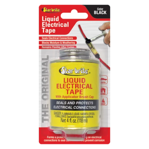 Prop 65 Warning CAStar Brite 4oz Liquid Electrical Tape Black. Liquid Electrical Tape (LET) is easy to use, providing an airtight, waterproof, dielectric coating in minutes. The coating will last for the life of the application, yet it can be removed immediately as needed. One application will protect terminal connections or splices, as well as guard against vibrations that can loosen connections. Star brite Liquid Tape is UL-tested, easy to use and reliable. Forms an airtight, protective, waterproof, UV resistant, dielectric coating. Prevents corrosion on wires and terminals, protects against vibration.