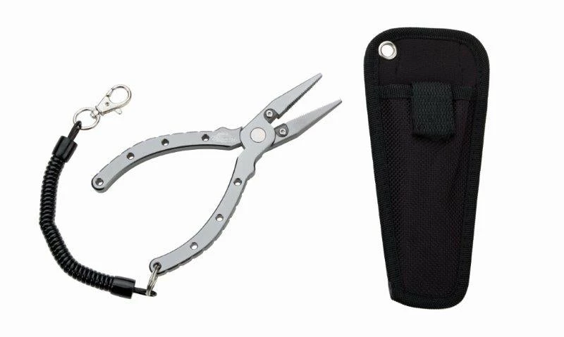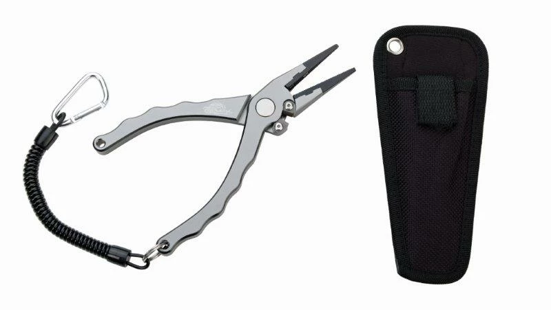 Prop 65 Warning CAThese Tsunami 6.5in or 7.5in ultra-strong aluminum pliers have tungsten carbide cutters that will cut braid or monofilament with ease. Also comes with coiled tether for security and a durable nylon belt holster.
