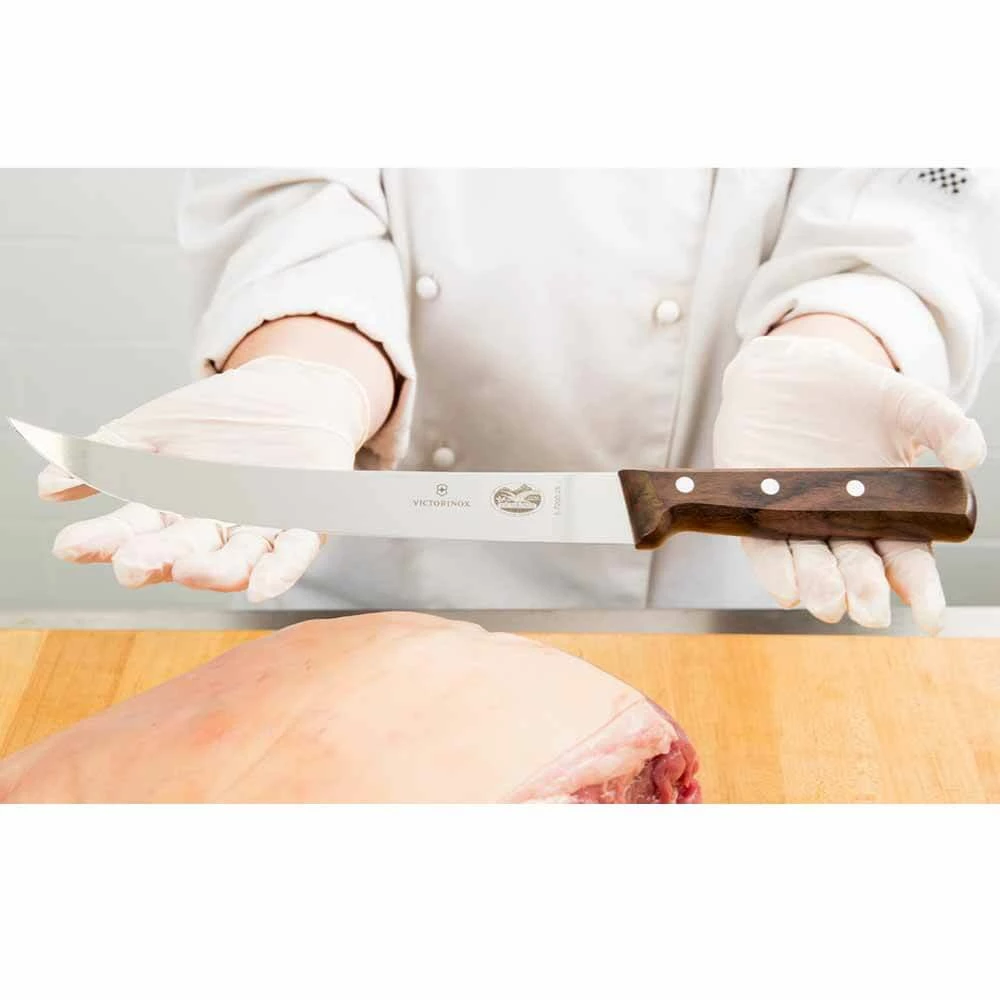 This Victorinox 47130 10″ curved breaking knife with rosewood handle is the optimal tool for trimming fat and breaking down large pieces of meat. Its curved design gives the perfect leverage against skin, bones, and cartilage, and easily trims unwanted fat for precise and lean cuts. The high-carbon blade is made of stainless steel, making it resistant to discoloration and corrosion. The rosewood handle provides an elegant look, and is contoured to fit comfortably in your hand. This knife is the perfect tool for any busy kitchen!