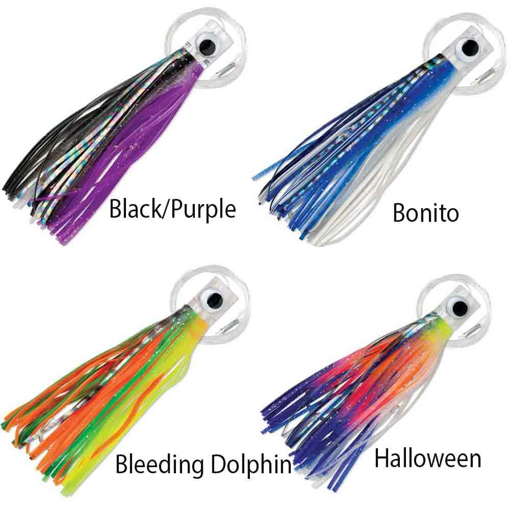 Williamson Rigged Dorado Catcher Lure. This flat-faced pusher style features a large cavity in the rear of the head specially designed to take a ballyhoo rigging spring. This allows you to get the bait in close to the head and skirt of the lure, giving the bait better protection at desired hiThis flat-faced pusher style features a large cavity in the rear of the head specially designed to take a ballyhoo rigging spring. This allows you to get the bait in close to the head and skirt of the lure, giving the bait better protection at desired higher trolling speeds. A great Dolphin and Sailfish lure.